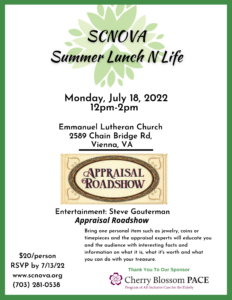 Join SCNOVA on Monday, July 18, 2022 at Emmanuel Lutheran Church from 12pm-2pm for a delicious Maggio’s lunch and an Appraisal Roadshow hosted by Steve Gouterman. Bring one personal item such as jewelry, coins or timepieces and the appraisal experts will educate you and the audience with interesting facts and information on what it is, what it’s worth and what you can do with your treasure. Cost is $20/person. Call 703-281-0538 to register or purchase your ticket below. RSVP by July 13, 2022.